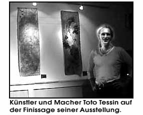 Einer der Macher, der Sozialpädagoge und Maler Toto Tessin nutzte die Möglichkeit selbst und präsentierte seine neuen Arbeiten unter dem Titel " Abstrakte Farbkombinationen in zirkularer Kausalität ". In kräftigen Farben, spontan und informel breitet er Gefühlswelten aus, die tief blicken lassen. Dies honorierte das Publikum, der Beweis, daß an diesem Platz Bilder (wenn auch zu sehr moderaten Preisen) verkauft werden können, wurde so nebenbei erbracht. Ein schöner Erfolg, der das Konzept der Betreiber bestätigt und jungen Künstlern Mut macht. mehr zur Arbeit von Toto Tessin unter www.rent-an-artwork.de. © universal arts - Verwendung nur im Rahmen unseres Lizenzmodells Photos: universal arts |