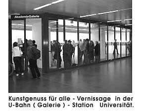 "Kunst im Untergrund" | ![]() Diesmal sind es drei Studentinnen C.Wieser, S.Ullmann und W.Waldmann, die sich hier für den ganzen April die Wände erobern konnten. Sie zeigen ein gemeinsam entwickeltes Konzept mit Malerei und Fotografie in Kombination, wobei beide Genres von allen drei Künstlerinnen abwechselnd ausgeführt wurden. Bei dieser Gemeischaftsarbeit ist einen Urlaubsfoto das Grundmotiv das als Vorlage für die Malerei benutzt wurde. Die malerische Umsetzung wiederum diente als weitere Fotovorlage, nach diesem Prizip reproduzieren und weitergeben und das reihum entstanden im Zeitraum eines halben Jahres 60 Bilder und Fotografien. Das Ziel war es mit der ständigen Wiederholung des gleichen Motives durch drei unterschiedliche Personen und deren malerische Herangehensweise eine Metamorphose oder zumindest eine Entfernung vom Original zu erzeugen. Ob dieser Effekt den drei Künstlerinnen gelungen ist, davon sollte man sich am besten vor Ort überzeugen, zumal sie auch während der Ausstellungsdauer dort anwesendend sein werden und Fragen der Besucher beantworten können. © universal arts - Verwendung nur im Rahmen unseres Lizenzmodells Photos: universal arts |