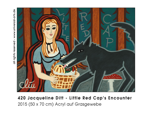 Die Ausstellung "Fairy Tales - Reloaded" ist dafür gedacht die Erinnerung aufzufrischen, Jacqueline Ditt zeigt neun Werke in gewohntem Stil, expressiv, surreal bisweilen auch mit Pop Art Elementen. Die Künstlerin gibt zu bedenken, dass es kritisch sein kann gerade die Gehirne von Kindern mit unterschwelligen Vorurteilen zu füttern. Zum Beispiel, junge Mädchen müssen hübsch, gutgläubig, gehorsam und unschuldig sein, ausserdem immer nach einem wohlhabenden Prinzen Ausschau halten. Andererseits sind ältere Frauen unansehnlich, Stiefmütter bevorzugt neidisch, eifersüchtig, gemein und auch hinterlistig. Während junge Männer gut aussehende Prinzen sind oder zumindest enorm gerissen um jede gefährliche Aufgabe zu bewältigen, häufig sind sie reich, oft sogar Könige, wenn sie älter sind, oder Helden und tapfere Ritter. All dieser "Märchen Stoff" ist zweifelsohne unterhaltsam, manchmal sogar lehrreich, deshalb will die Künstlerin sie auch substanziell nicht ändern aber sie sind was sie sind, sehr populäre "Alte Geschichten" und in Bezug auf tradierte Rollenklischees sollten wir uns doch eher in Richtung Emanzipation bewegen. - Ausstellung 2015 - "Fairy Tales - Reloaded" - 7 Gemälde und 2 Grafiken von Jacqueline Ditt
