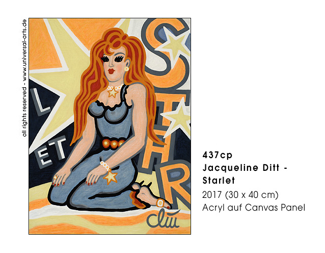 What does it mean to be a star? Being one of the millions or more as we know it from the infinite universe? Or is it a special spirit that makes you emerge from the masses, to make them follow you like a messiah? And what does it mean to the person that is picked as a star? The best known at least has to serve his fans as compensation for the wishes and dreams they can not reach in their own life. Sometimes a star can fail in fulfilling these high hopes. However, in the best way he will be able to leave the stage as an icon, but as a matter of fact this won't touch the universe, because in these dimensions this fact has not even the meaning of a single grain of sand on the beach - Exhibition 2017 "All the Stars" 7 paintings and 2 graphics by Jacqueline Ditt